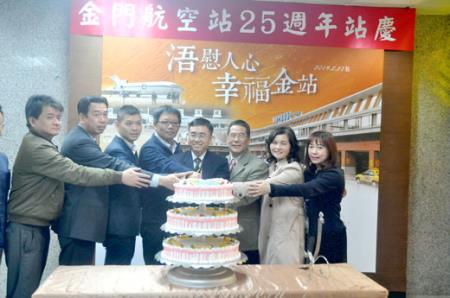 昨日活動由行政院金馬聯合服務中心執行長翁明志、縣府觀光處副處長李銘培、航站主任洪念慈、昇恆昌國際免稅店總經理江建廷、昇恆昌金門金湖營業部副總白國良、聖祖公司總經理陳緣姿及立榮航空金門營業處主任陳連澄、華信航空金門營業處經理黃世賢等主管共同揭幕,並切下站慶蛋糕,分享航站成立25週年的喜悅。