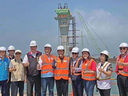 交通部長林佳龍、金門縣長楊鎮浯、縣議長洪允典偕立法院交通委員會委員陳雪生、李德維、陳玉珍、魯明哲等人上橋見證首座節塊吊掛作業。