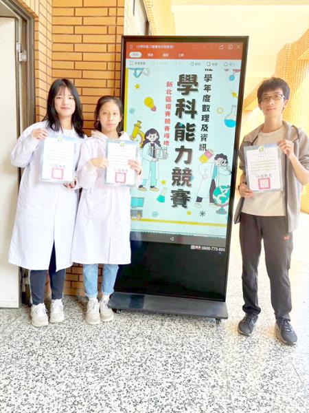 金門高中此次赴台參加新北區複賽,共計有物理科、化學科、生物科、地球科學科等四科,在強手林立的賽中,表現也是十分不俗,獲獎學生分別有:蔡侑岑(地球科學科第三名,指導老師薛郁潔)、翁可盼(地球科學科佳作,指導老師薛郁潔)、辛佳皓(物理科佳作,指導老師余亭均)、張聖齊(物理科佳作,指導老師余亭均)、董芷菱(化學科佳作,指導老師戴如妮)、李昱柏(生物科佳作,指導老師林昀霈)。
