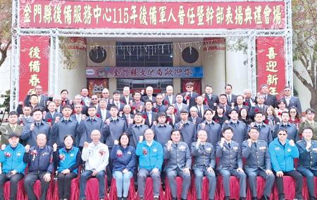 金門縣後備服務中心昨(1)日上午於金門縣文化局舉辦「115年後備軍人晉任暨幹部表揚典禮」,由後備指揮部指揮官俞文鎮中將主持,邀請金門縣副縣長李文良、立法委員陳玉珍、行政院金馬聯合服務中心執行長吳增允、縣議員洪成發、南部地區後備指揮部金門委顧團副團長許玉昭、文化局長陳榮昌、民政處長陳國興、金城鎮長李誠智、金沙鎮長吳有家、金湖鎮長陳文顧、金寧鄉長楊忠俊等多位中央及地方貴賓蒞臨觀禮,共同見證後備軍人晉任及績優幹部表揚的榮耀時刻,場面隆重而溫馨。