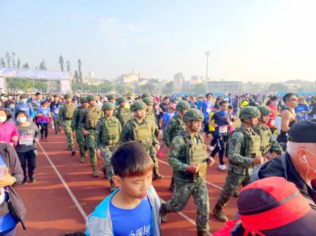 此外,昨日陸軍金防部金門守備大隊以及烈嶼守備大隊也派出部隊弟兄,全副武裝,身上裝備高達7公斤,與其他民眾簡便輕裝形成強烈對比。阿兵哥們在前導軍官手持隊旗的引導下,全體官兵步伐一致、口號宏亮、隊伍整齊劃一,跑在大批人群當中相當顯眼,同時也十分吸睛。不少民眾直說,果然很有戰地風格的馬拉松。不只是現役軍人,也有退伍老兵特別趕回金門參加,甚至全副武裝跟著跑,展示出他們當年年輕的英姿。