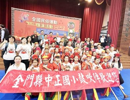 中正國小鼓吹陣參加運動部全民運動署主辦的「114年全國民俗運動匯演」,以整齊磅礡、技藝精湛的演出,深獲評審一致肯定,再度勇奪特優,締造全國文陣類賽事「十一連霸」紀錄,表現卓越,堪稱全國傳統文陣之翹楚。因演出亮眼,中正國小鼓吹陣亦獲大會徵召擔任開幕迎賓演出,成功向全國展現金門深厚的民俗文化底蘊。