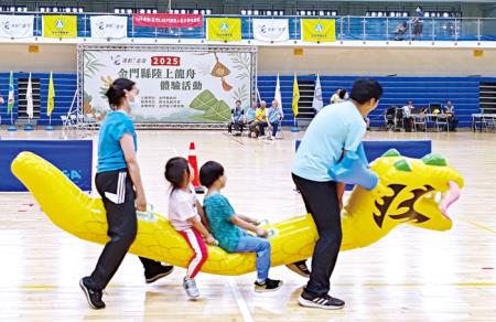 本次活動結合傳統龍舟與創意趣味競賽形式,參賽隊伍在體育場金城館木質綜合球場上以龍舟造型的充氣龍舟進行多人合力趣味競賽,不僅考驗親子團隊默契與體能,也讓民眾在運動中體驗節慶氛圍與趣味挑戰,透過趣味競賽的方式,讓大小朋友們體驗同舟共濟的精神,促進親子互動,營造美好的家庭及社會氛圍。