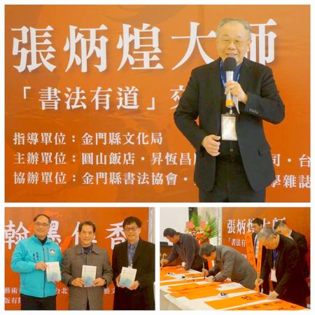 隨後,主辦單位邀請到享譽國內外的書法家張炳煌先生擔任講座,並與金門書法學會及在地書法家同好在農曆年前一同揮毫春聯,活動的主題為「書法有道」。張炳煌教授在演說中談到「書法有道」有傳承之道和精進之道兩層意義,他提到書法在不同國家有不同的稱呼,例如我國叫「書法」,日本叫「書道」,韓國叫「書藝」,而他認為應該稱之為「書學」。