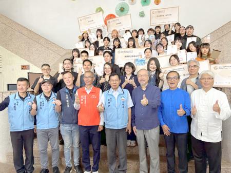 另外,亞洲大學執行團隊林磐聳教授及伊德視覺形象設計總監涂以仁也分別致詞,強調計畫的重要性與對年輕設計人才的期待。在簡短的致詞後,進入了精彩的頒獎環節,16組入選團隊依次上台領獎,並與來賓合影留念。