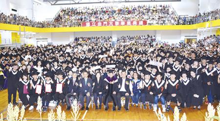 金門大學畢典於昨天下午二時三十分舉行,蔡總統親臨出席,內政部長徐國勇、教育部次長劉孟奇、陸委會副主委邱垂正、金門縣長楊鎮浯、立法委員陳玉珍及各界貴賓均出席典禮。今年度,金大應屆畢業生總計有四十班、一千零五十四位,分別完成二年碩士班或四年學士班的學習歷程,即將邁向人生另一段重要旅程。