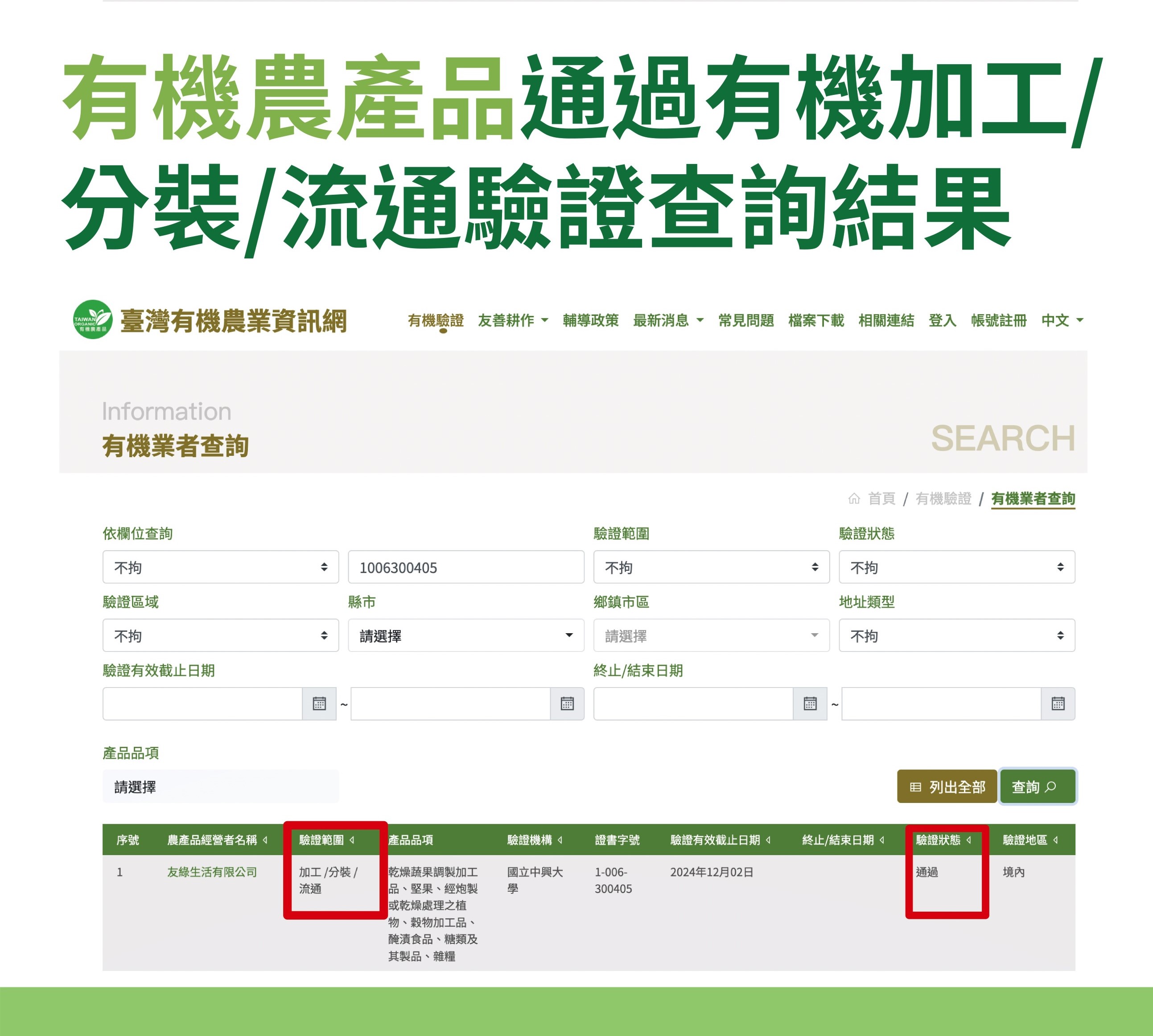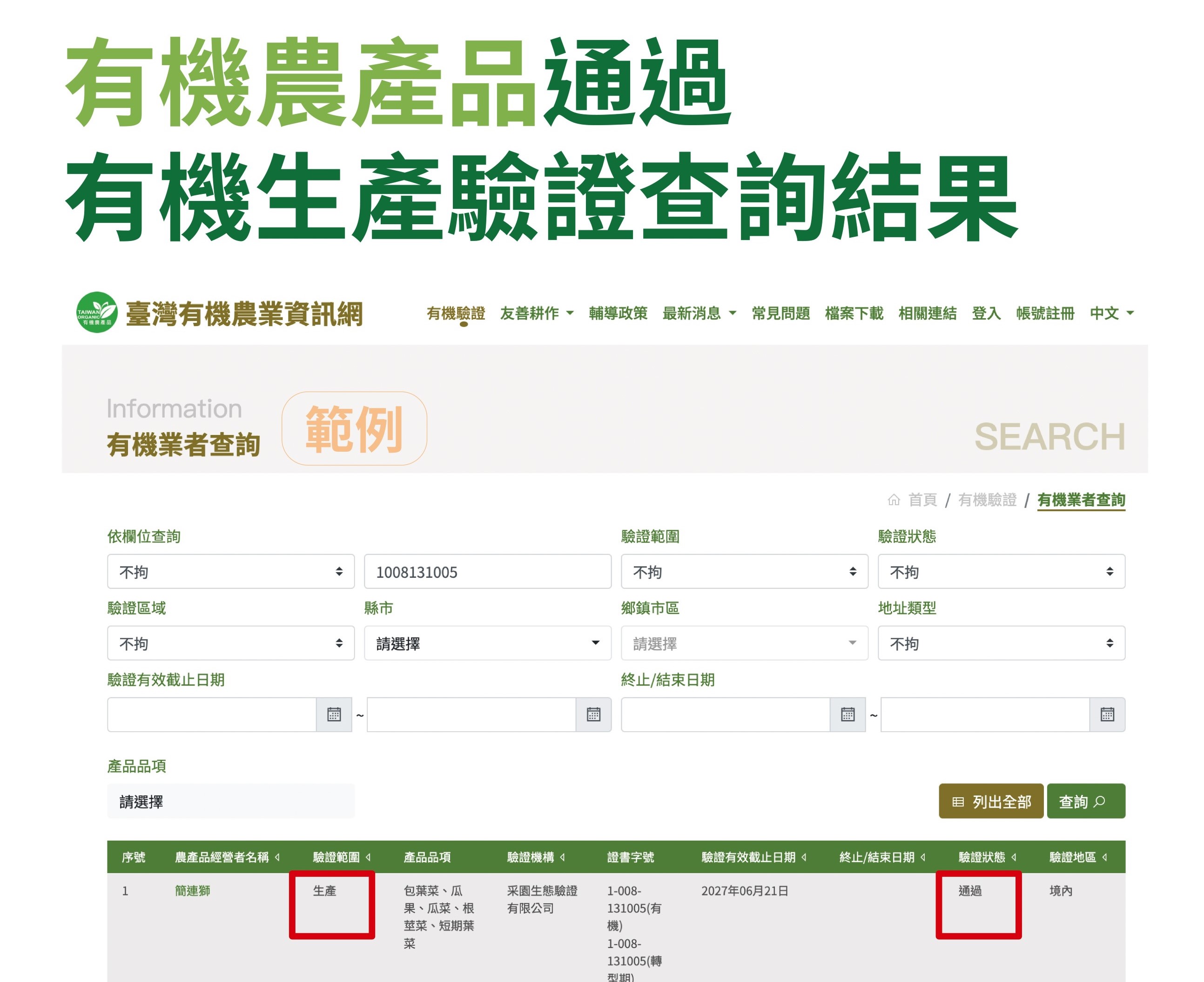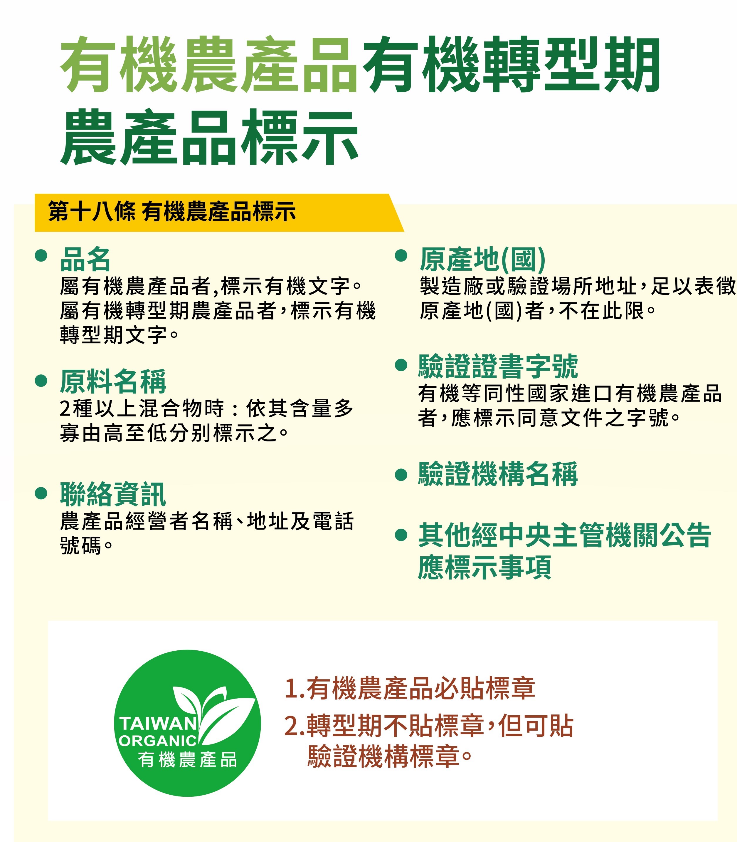 農業部農糧署強調,標示「有機」的國產農產品,須於通過驗證機構依有機農業促進法規定的有機農產品有機轉型期農產品驗證基準之驗證,才可以使用國產有機農產品標章,且有機農產品經營者須完整記錄產銷流向,確保有機完整性。