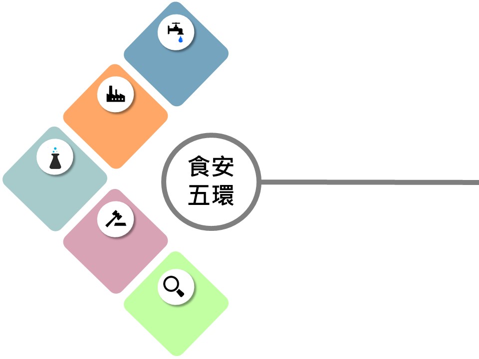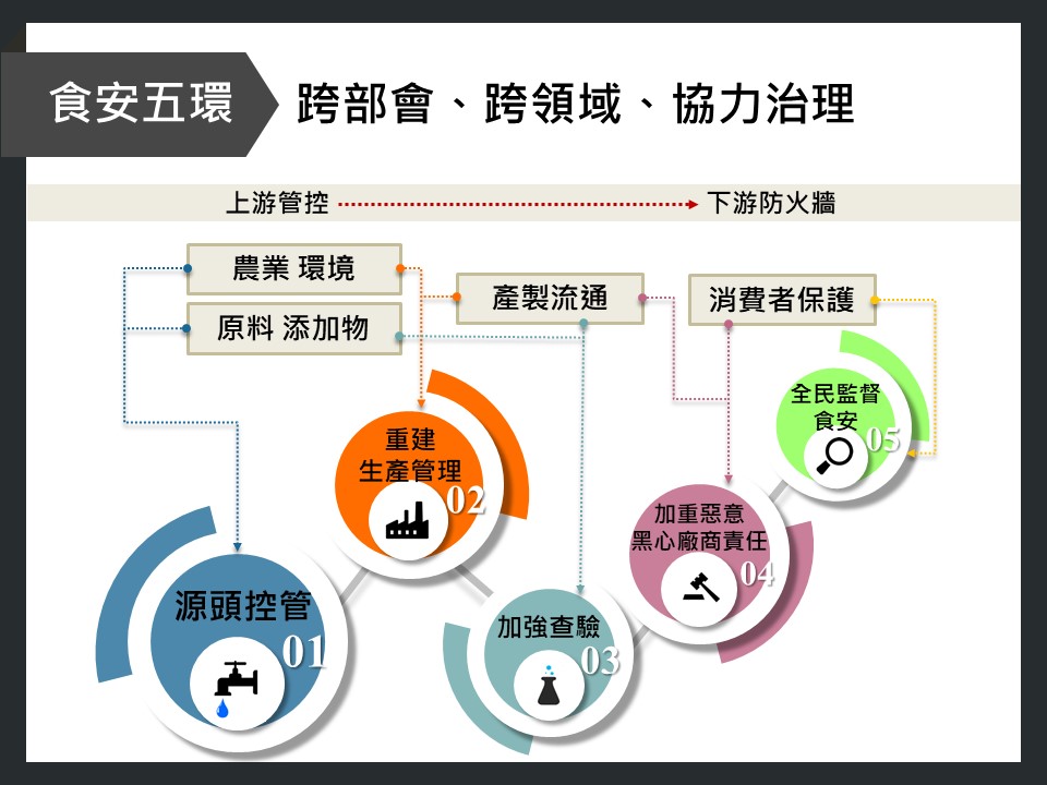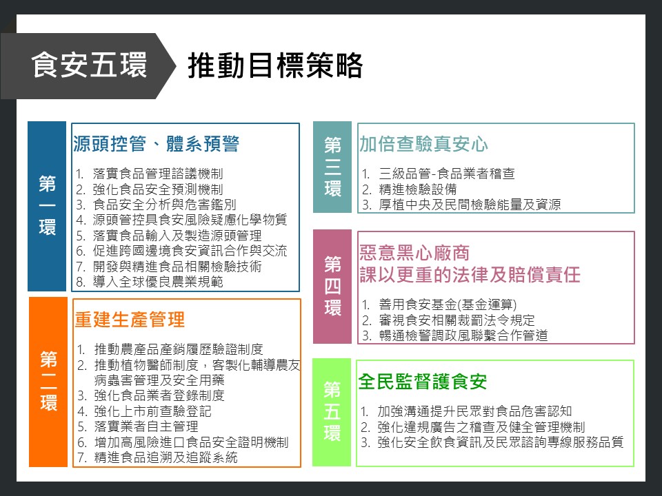 過去幾年臺灣發生許多食安問題,讓食安議題備受關注,總統蔡英文在下鄉訪視行程中,最常接觸的議題就是許多家庭主婦擔心食安問題所造成的傷害,食安既然是社會各界共同面對的重大議題,就有必要予以釐清與解決。為了落實蔡總統的政見,政府提出「食安五環」改革方案來因應食安問題,第一環是「源頭控管」,只要食品的進口或生產有問題,就要從源頭掌握資料、予以控制;第二環是「重建生產管理履歷」,消費者在購買產品時,可以透過產品上的資料來追溯生產流程、生產者和經銷商等相關資料,只要食品的履歷流程清楚、資訊透明,消費者才能掌握相關資訊、安心購買。政府也應具備足夠的市場查驗能力,因此在食安第三環,就是「提高查驗能力」(10倍查驗能力),將現行政府的查驗頻率、強度都提高,萬一有食安漏洞,在查驗時能夠防範;第四環是「加重生產者、廠商的責任」;第五環是「鼓勵、創造監督平臺」,讓全民與消費者都能夠監督食品安全的詳細環節,並有充分資訊瞭解每一個食品可能發生的狀況。