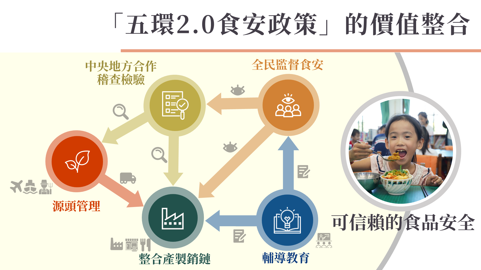 食品安全衛生係民生關切議題,亦為政府重大政策,政府推動食安五環政策已有8年,相關政策需滾動調整並不斷精進,以因應當前面臨的問題與挑戰。為研擬新階段跨部會之食品安全政策,維護國人食的建康與安心,本院食品安全辦公室集結衛生福利部、農業部、環境部、教育部、經濟部、數位發展部等相關部會,自本(113)年賴清德總統就職起,共同研議新提出「五環2.0食安政策」,分區分眾與學者專家、產業代表、消保團體溝通討論,並提報本院113年第2次食品安全會報,經院長裁示實施,後再經跨部會研商細部工作項目及分工,以此作為未來四年各部會推動食安建設的基礎架構。