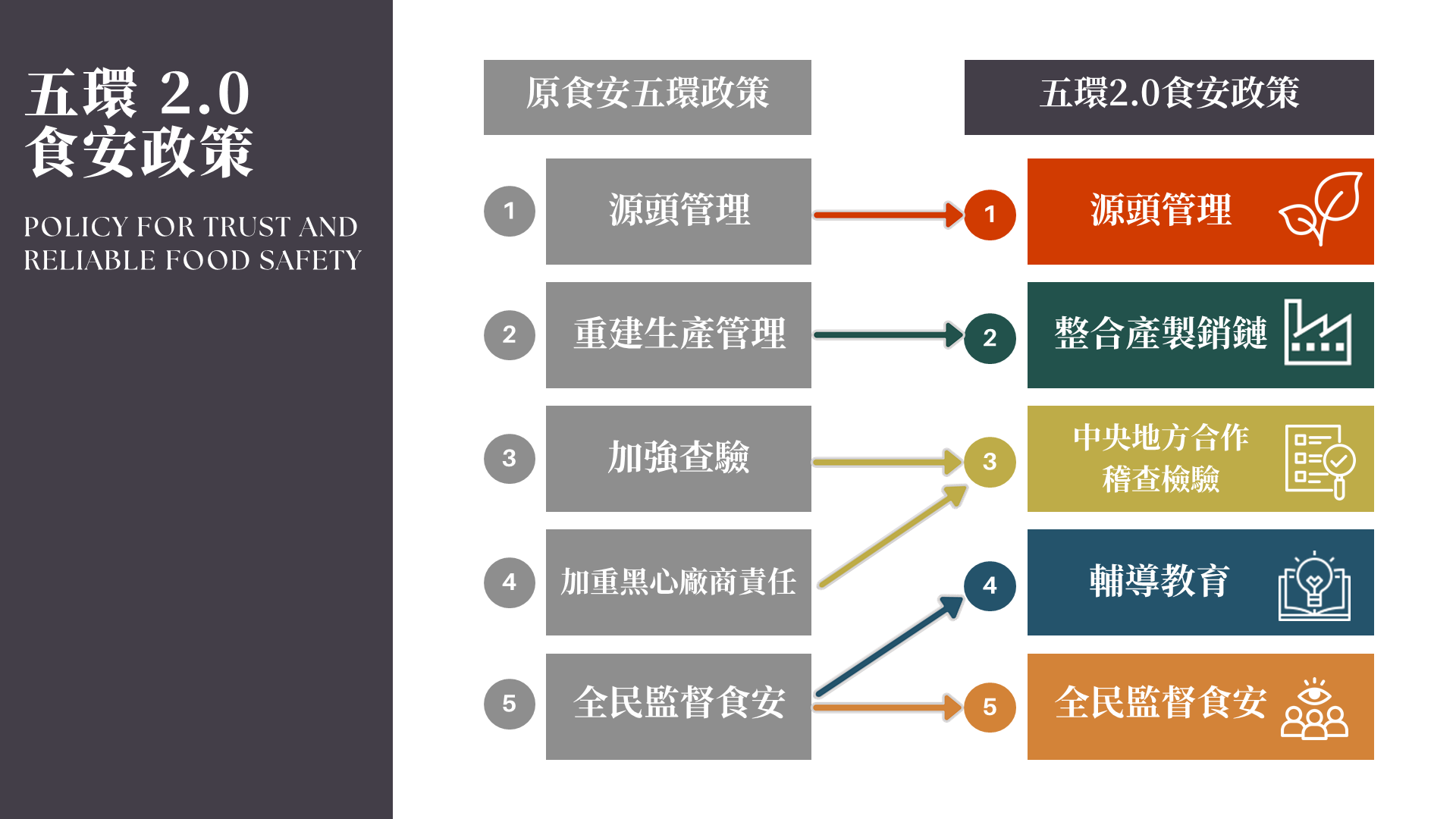 新階段「五環2.0食安政策」,除了保留原有的食安五環工作項目,並檢討近年發生系統性或重大食安事件(例如:辣椒粉含蘇丹色素、寶林茶室食品中毒事件),研擬納入相關加強措施。未來四年,也將著重於食品業者對於問題產品之迅速下架回收,精進食安數位發展、檢討重建追蹤追溯系統,以建構更完善的食品追蹤追溯體系、加強國內食品產製銷鏈之安全衛生,提升國人對食安的信任,並且達到政府管理、產業自律及民間參與之目的。