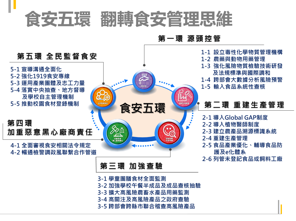 「食安五環」是蔡英文總統提出的政策,從各個面向加強食安管理,七年多來已有顯著進步,謹將食安五環推動成果概要,彙整於下方檔案,敬請各界先進參閱並批評指教。政府將持續推動食安管理政策,共同守護國人食品安全、打造健康安心的生活環境。