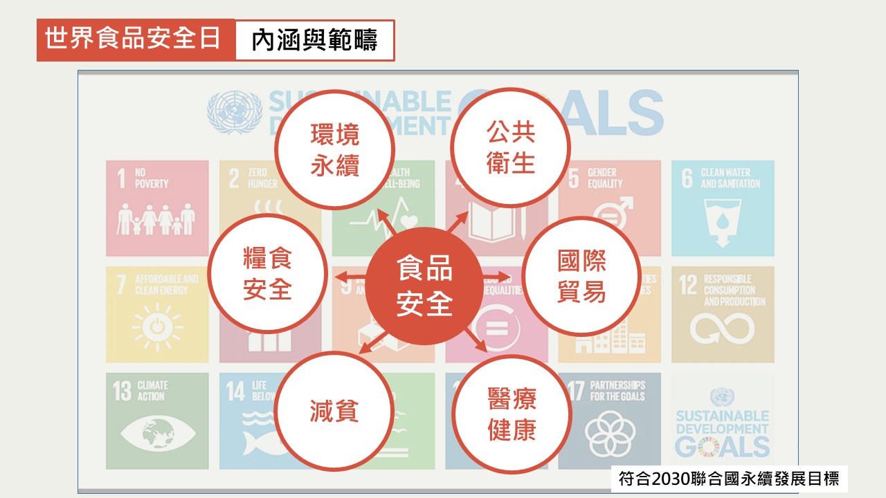 107年12月20日聯合國大會決議,從108年起,每年6月7日為「世界食品安全日」,該會認為實現食品安全係促進達成「2030年永續發展目標」之方式之一,對於糧食安全、公共衛生、醫療健康、國際貿易、減貧及 環境永續等範疇有積極正面作用,設立背景及其內涵與範疇可見下圖所示: