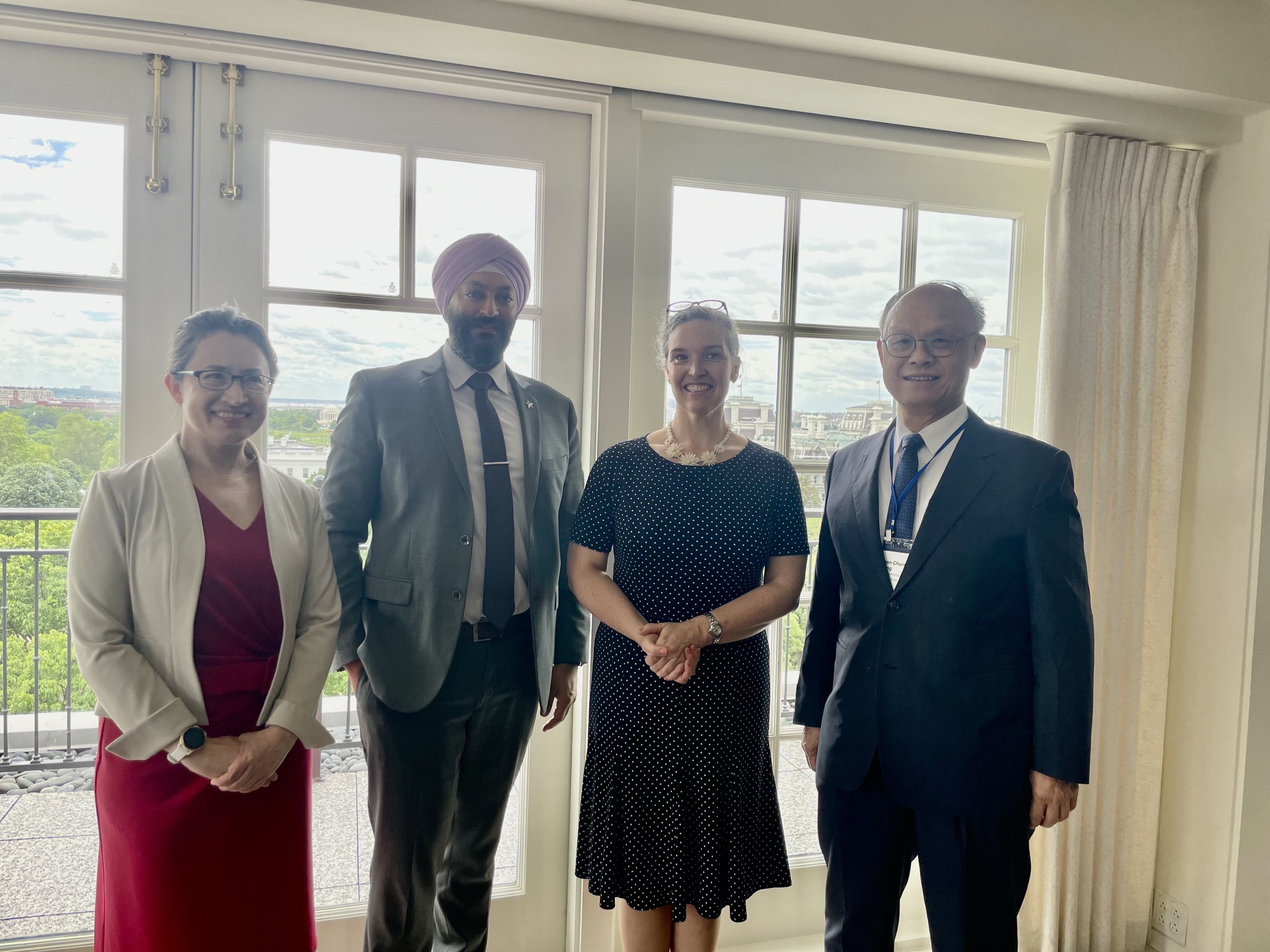 鄧政委出席由駐美代表蕭美琴大使主辦之2023SelectUSA歡迎酒會。(合影賓客: SelectUSA執行主任Jasjit Singh(左二)及美國在台協會處長孫曉雅(右二))