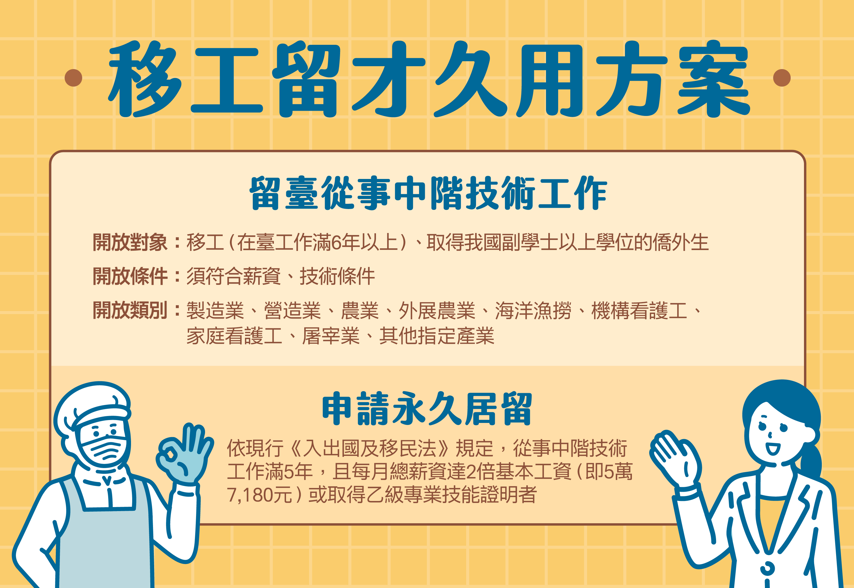 為減緩少子化,國內勞動力短缺影響,自111年4月推動「移工留才久用方案」,在臺工作達6年以上之移工、或在臺工作達11年6個月以上已離境之移工、取得我國副學士學位以上之僑外生,若符合薪資門檻、技術條件,得由雇主或歷任雇主提出申請轉任為中階技術人力,得留臺從事海洋漁撈、製造業、營造業、屠宰業、農業及看護工中階技術工作,渠等未來在臺即無工作年限限制,工作滿5年以上,可向內政部移民署申請永久居留,以減緩雇主缺工影響及延攬熟練技術外國人才。截至113年,計核准4萬115人。