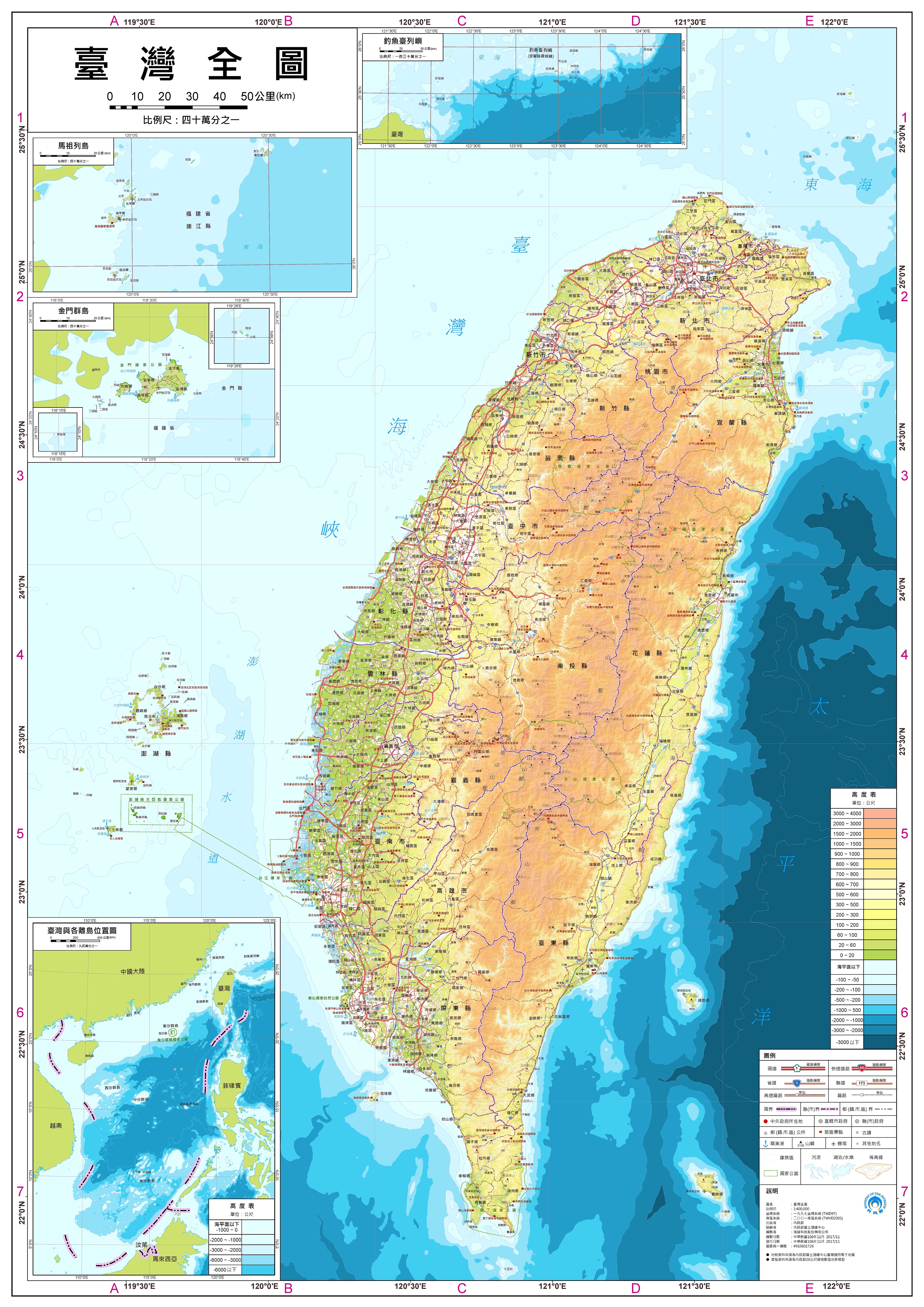 臺灣東臨太平洋,西隔寬約200公里之臺灣海峽與福建省相望,南界巴士海峽,與菲律賓相距約250公里;北瀕東海,東北與琉球群島相距約600公里(詳見表1)。臺灣之名屢有變更,隋時稱流求;宋時稱琉求;元時名瑠求;明洪武時稱小琉球;明萬曆年間稱雞籠山、北港、東番;明鄭時期則稱東都、東寧,至清康熙23年,清廷改東寧為臺灣,置臺灣府,隸福建省,臺灣正式名稱自此始。臺灣係海中褶曲隆起之海島,就地質學言,為一新生代褶皺山脈,位於歐亞大陸與太平洋海盆之接觸線上,居東亞島弧中央,係由歐亞大陸板塊與菲律賓板塊撞擊形成。臺灣本島呈紡錘形,南北縱長394公里,東西最大寬度144公里,環島海岸線長1,150.95公里,跨越緯度約在北緯21至26度之間,北回歸線(北緯23.5度)通過嘉義縣水上鄉。臺灣本島及其21個附屬島嶼面積共3萬5,887.1325平方公里,附屬島嶼中,較重要者有蘭嶼(46.82平方公里)、綠島(15.09平方公里)、琉球嶼(6.8平方公里)、釣魚臺(4.38平方公里)與龜山島(2.84平方公里)。