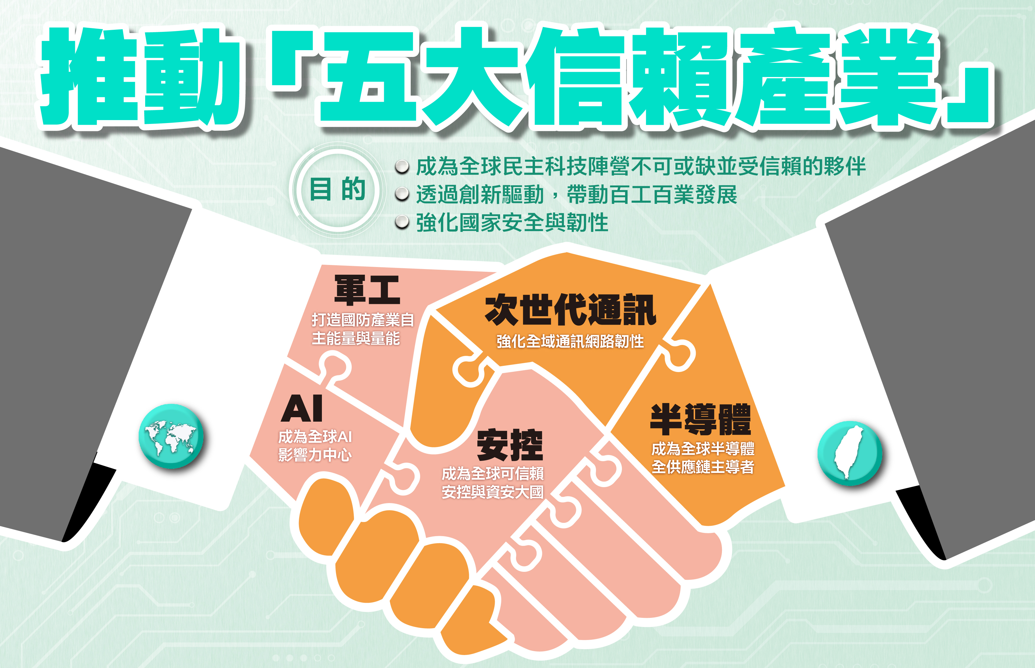 透過「五大信賴產業推動方案」讓臺灣成為全球民主科技陣營不可或缺並受信賴的夥伴,藉由創新驅動帶動百工百業發展、創造高薪就業,以及強化國家安全與韌性。