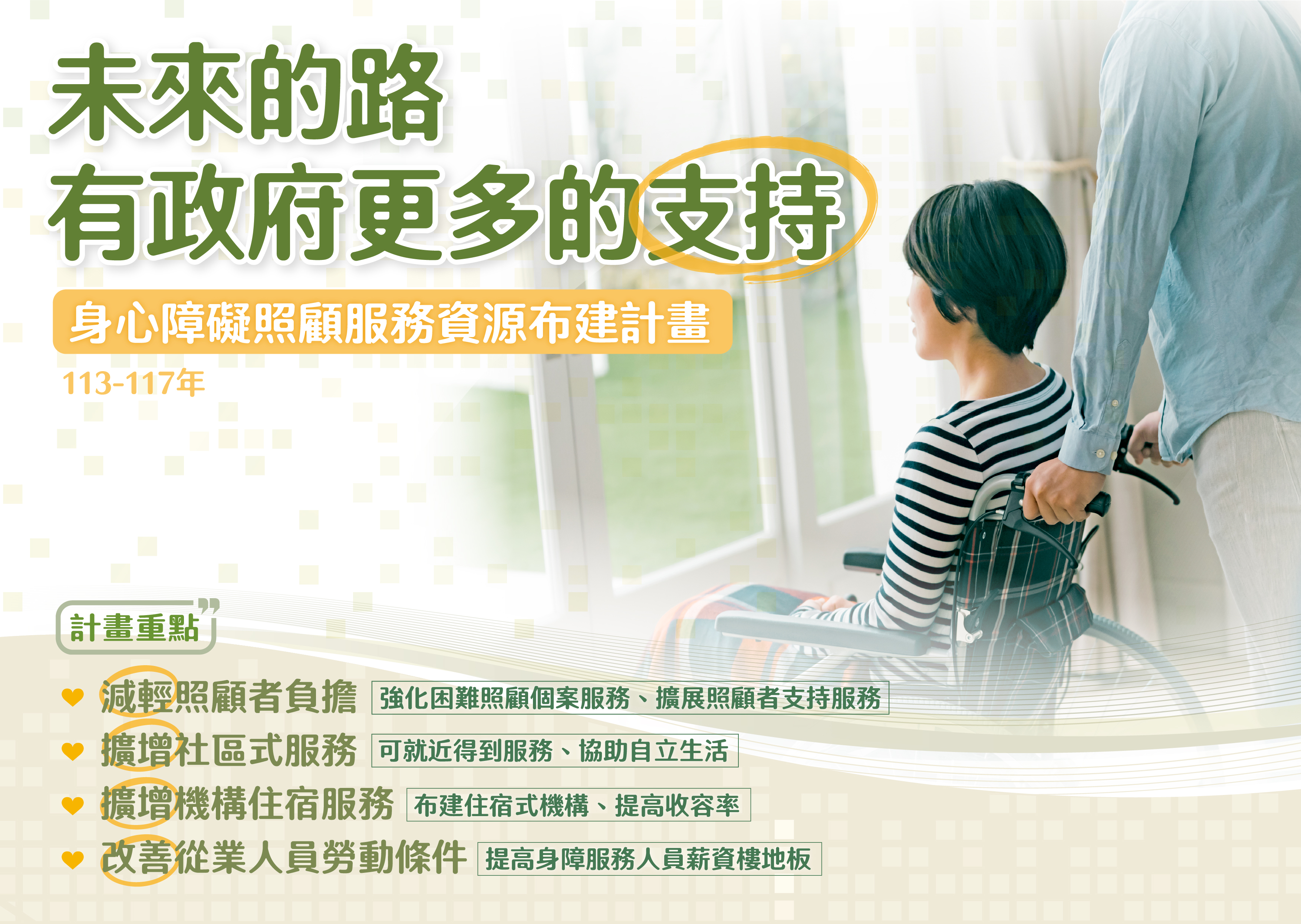 推動「身心障礙照顧服務資源布建計畫」(113-117年),減輕家庭照顧負擔。