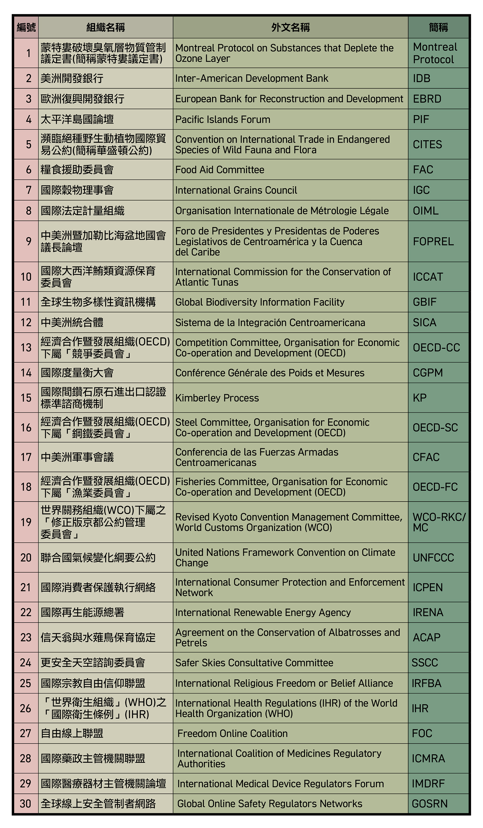 另外,近年我國掌握國際社會更加重視民主治理、國際隱私保護、資訊開放及自由、宗教自由及原民合作等議題的契機,加入相關新興國際組織及機制,並持續積極參與。