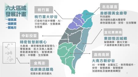 為落實賴總統「均衡臺灣」的施政方針,政府從國家整體觀點推動「六大區域產業及生活圈」,將以北北基宜為「首都圈黃金廊帶」、桃竹苗為「桃竹苗大矽谷」、中彰投雲將推動成為「精密智慧新核心」、嘉南高屏以「大南方新矽谷」、宜花東屏南則朝「東部慢活城鄉」、金馬澎發展為「低碳樂活離島」等發展定位,完備產業發展與公共建設空間均衡布局,確實達成增就業、提薪資、繁地方的三目標。