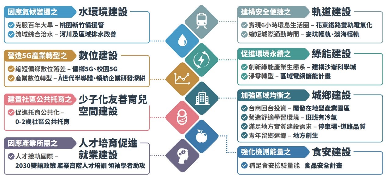 為振興經濟、帶動整體經濟動能,因應國內外新產業、新技術及新生活趨勢,政府自民國106年起積極推動「前瞻基礎建設計畫」,推動包含促進環境永續的「綠能建設」、營造智慧國土的「數位建設」、因應氣候變遷的「水環境建設」、建構安全便捷的「軌道建設」、加強區域均衡的「城鄉建設」、「因應少子化友善育兒空間建設」及「食品安全建設」和「人才培育促進就業建設」等8項建設。112年起配合2050淨零轉型政策,於綠能建設項下新增前瞻技術投入、強化系統整合、擴大既有能量、推動公正轉型等相關計畫,以促進經濟成長,帶動民間投資並創造綠色就業。