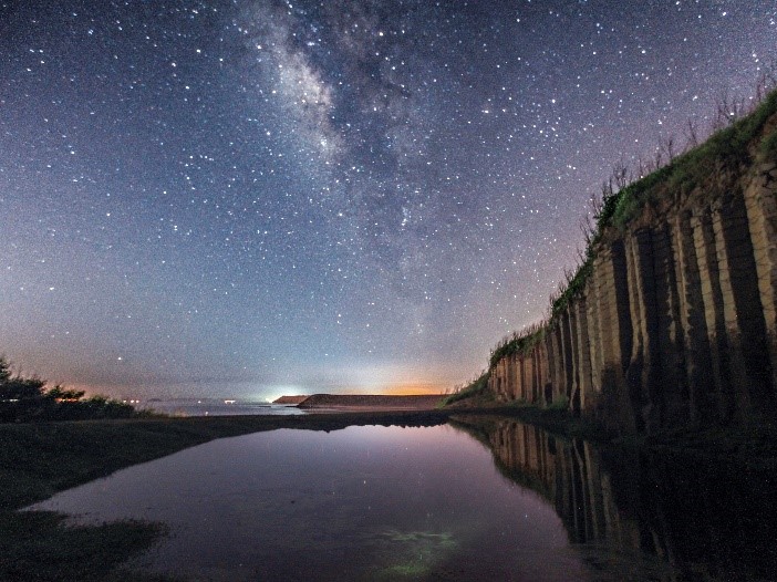 澎湖大菓葉柱狀玄武岩:每當大雨過後,在玄武岩前方會形成水漥,倒映著玄武岩石柱,夜晚星空燦爛,是拍照最佳景點之一。(圖/澎湖國家風景區管理處提供)