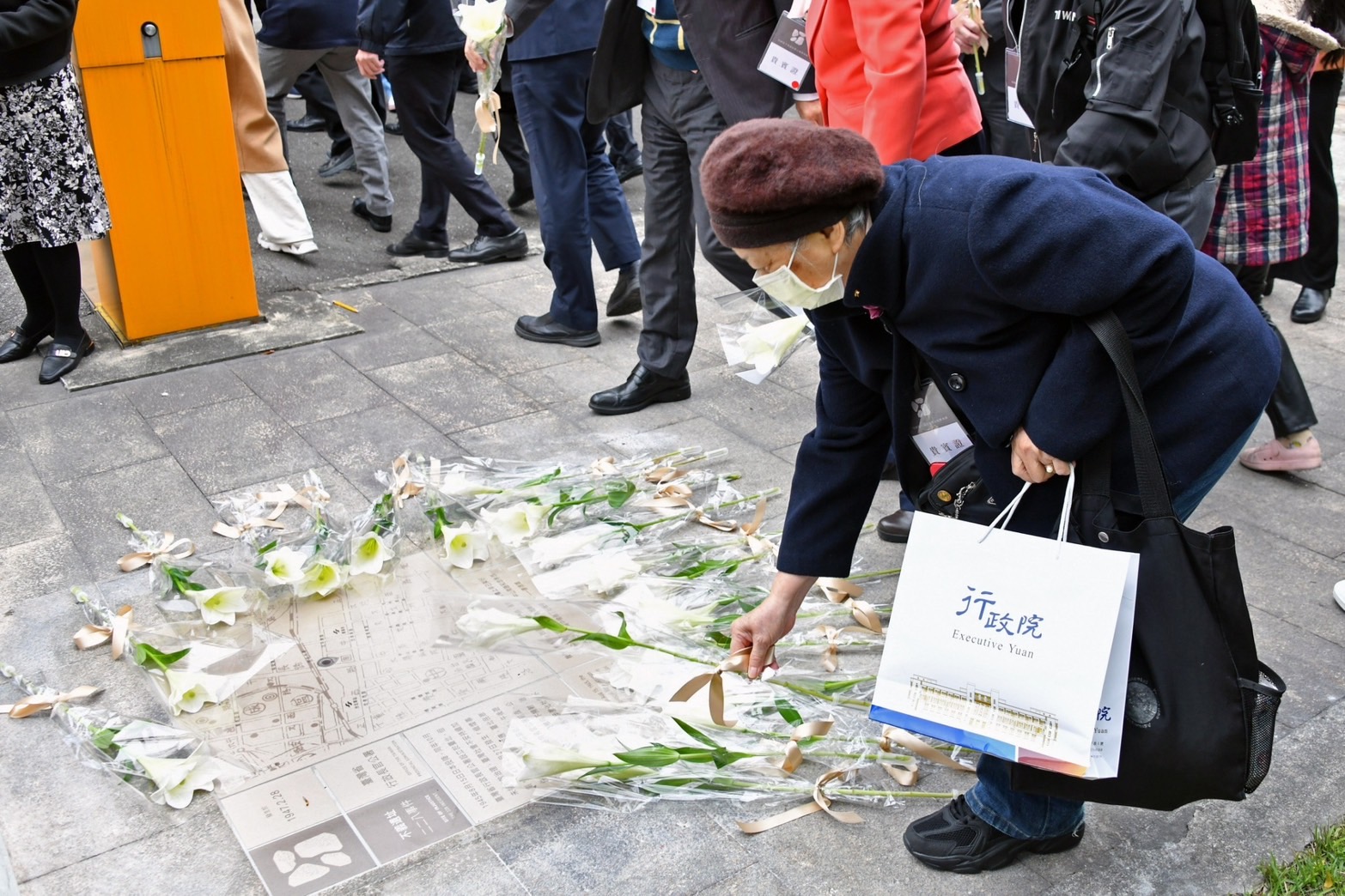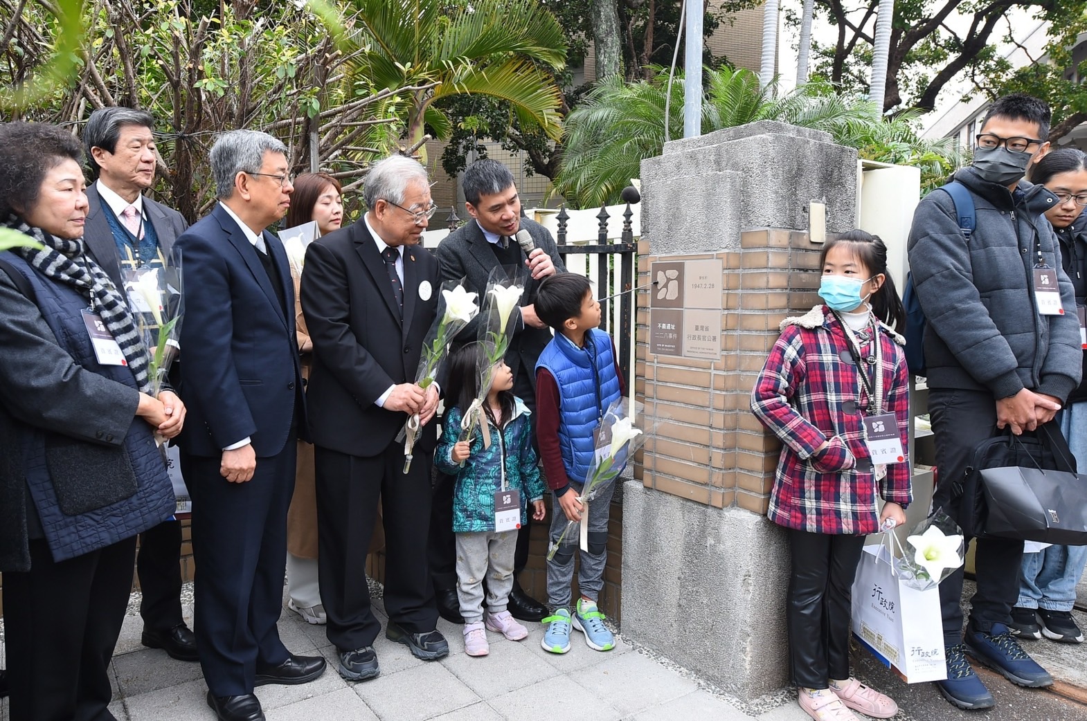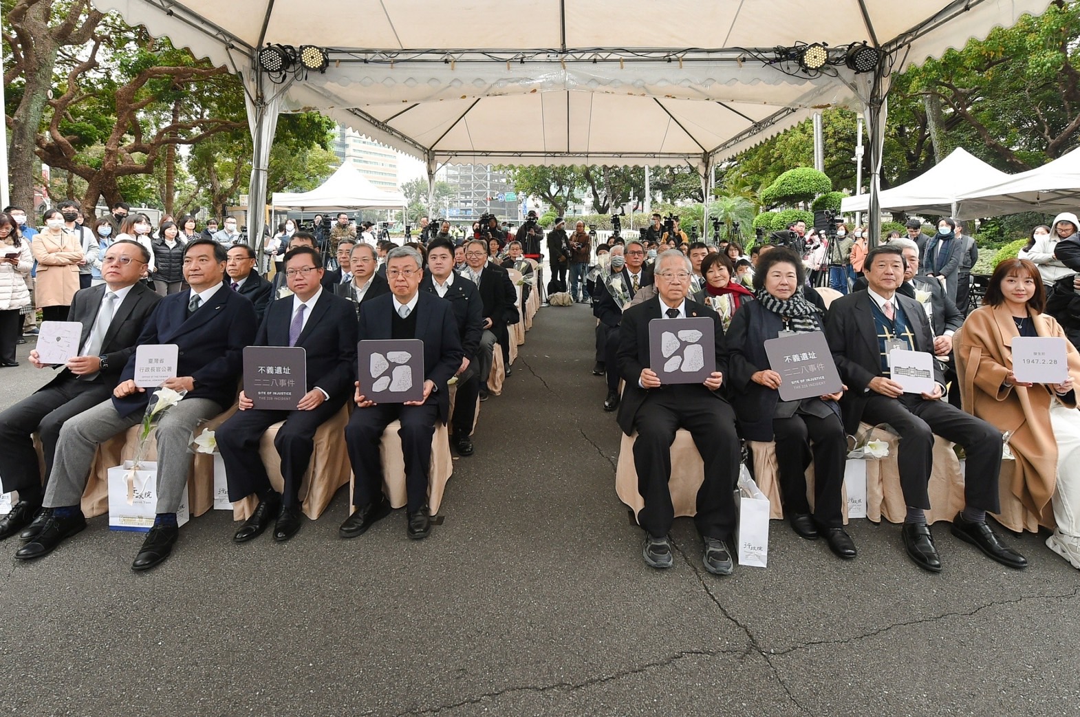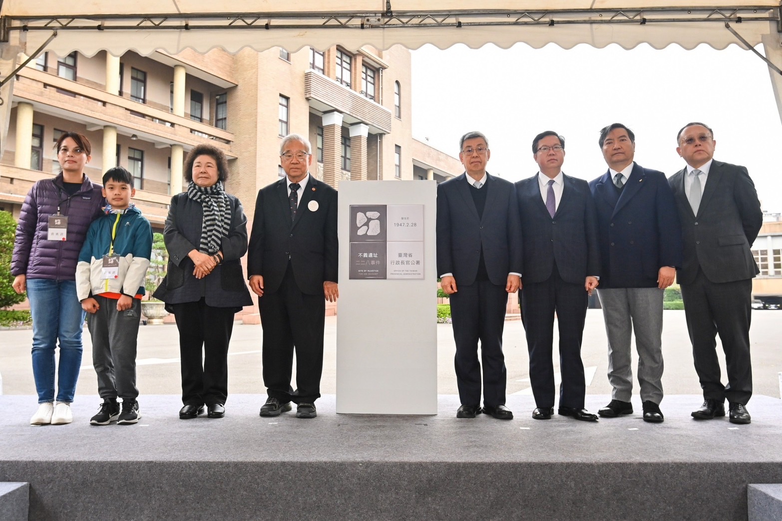 陳院長抵達會場後,首先偕同臺灣二二八關懷總會王文宏理事長、監察院院長兼國家人權委員會陳菊主任委員、監察委員兼國家人權委員會蔡崇義副主任委員、臺灣史阿娘餵協會張雅琳理事長(同為新任立法委員)、行政院鄭文燦副院長、羅秉成政務委員、文化部史哲部長等人手持「不義遺址標示」手板進行大合影,隨後聆聽王文宏理事長代表受難者家屬致詞;陳院長致詞結束後,與陳菊主委等人一同揭下布幕,完成揭牌儀式。接著,陳院長一行在行政院人權及轉型正義處賴俊兆Semaylay i Kakubaw處長的陪同解說下,分別前往行政院3處不義遺址標示,聽取該標示系統的設計說明。不義遺址標示系統呈現威權統治時期侵害人權歷史事件發生的時間、地點、事件經過、口述歷史證言等基礎資訊,也以QR code連結不義遺址資料庫網站,可以深入瞭解不義遺址的相關介紹與審定緣由;不義遺址標示圖形識別則以石頭裂縫空間形成人形身體,企圖呈現出「受壓迫」及「奮起」的意象。此外,賴俊兆Semaylay i Kakubaw處長補充行政長官公署在1947年鎮壓抗議民眾的始末,與周邊不義遺址的介紹,如臺北郵局、天馬茶房、臺灣省保安司令部軍法處看守所、華山貨運站等處。陳院長一行也在人行道地磚紀念碑獻花致意,場面莊嚴隆重。