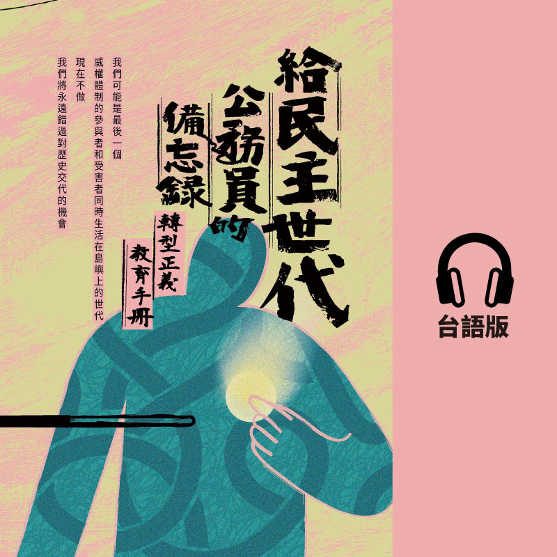 面對教科書或日常生活中,反覆出現的幾個關鍵字:民主、自由、人權、憲政、法治,是否常常讓人感到陌生,甚至教條?行政院人權及轉型正義處製作有聲書《給民主世代公務員的備忘錄:轉型正義教育手冊》,以歷史脈絡、事件發展與人物形象為素材,並運用一段段前人經歷的艱難故事,為我們記下這個世代的備忘錄。這些看似抽象的關鍵字,都是無數個人,曾經歷過國家逾越憲政紅線時砸落的政治暴力、緊縛的控制網絡,而後銘刻而成的。